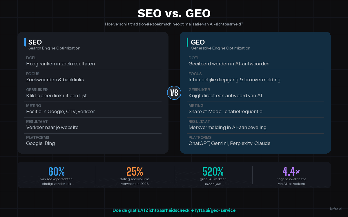 Benieuwd hoe zichtbaar jouw bedrijf nu is in AI-zoekmachines? Doe de gratis AI Zichtbaarheidscheck van Lyfta → lyfta.ai/geo-service